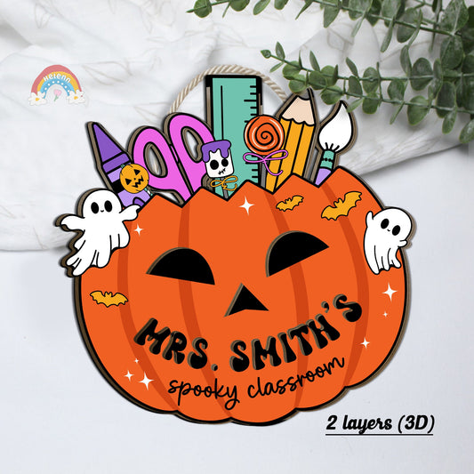 Custom Halloween Teacher Door Hanger Wooden Classroom Door Sign, Pumpkin Teacher Halloween Decoration Spooky Teacher, Teacher Halloween Gift