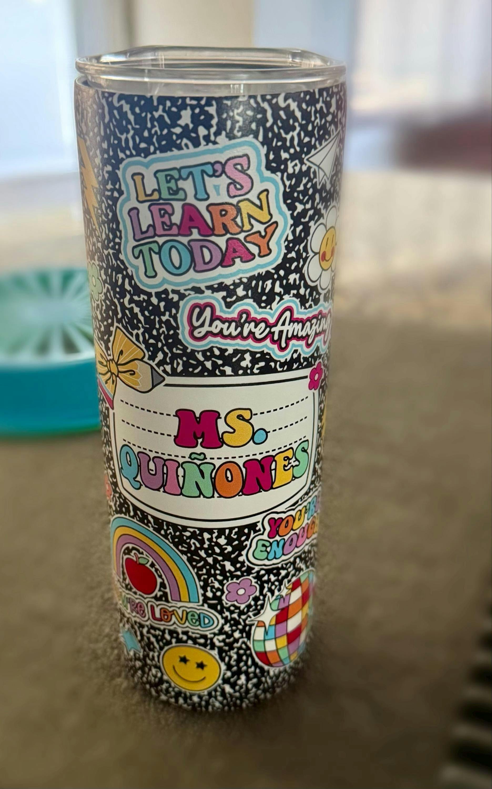My little sis works at a school and absolutely loved this tumbler! Such a fun, colorful gift that made her smile! She especially liked the black composition book background because it reminded her of when she was in school.